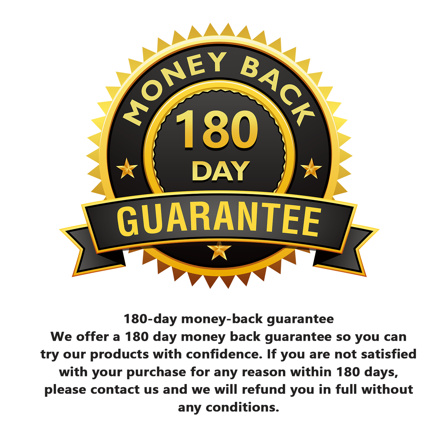 🤗180-day money-back guarantee We offer a 180 day money back guarantee so you can try our products with confidence. lf you are not satisfied with your purchase for any reason within 180 days, please contact us and we will refund you in full without any conditions.